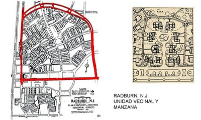 El concepto de unidad vecinal aparece en sus líneas básicas en el séptimo volumen del trabajo Regional Survey of New York and Its Environs publicado por Perry en 1928 y ya perfectamente desarrollado, diez años después, en su libro Housing for the Machine Age. En concreto, para Perry una unidad vecinal (neighborhood unit) es “un área poblada, delimitada físicamente por vías de tráfico, de modo que las vías internas queden solo para uso de la comunidad. Pero, al mismo tiempo, este fragmento espacial así obtenido debe de ser capaz de mantener y requerir una escuela primaria, para una población total comprendida entre 5.000 y 6.000 personas”. El principio de la unidad vecinal se experimenta ya a finales de los años veinte por el equipo de la Regional Planning Association of America, con el asesoramiento de Perry, en la barriada de Sunnyside Gardens de Long Island. Pero, sobre todo, donde adquiere características verdaderamente importantes es en el suburbio de Radburn en New Yersey proyectado por A.J. Thomas, T. Adams, Stein y H. Wrigth y al que me he referido en distintos artículos de este blog.